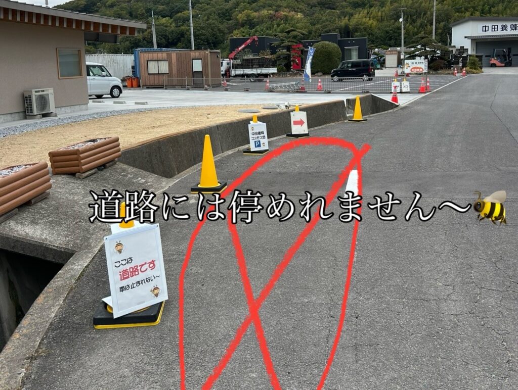 一度にたくさんのお客様に来ていただいているため、お店ではお待たせしたり混み合ったりとご迷惑をおかけしています🙇お店の裏側すぐとフェンス越しの臨時駐車場が中田養蜂の駐車場です