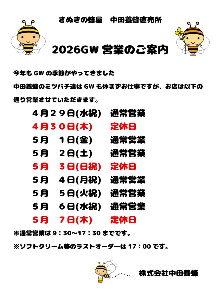 中田養蜂直売所GW営業のご案内